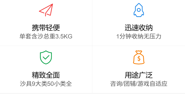 更为经济、轻快、便捷的个体和团体沙盘工作套装。24人团体工作设备整体携带体积不超过0.15m³(只需要轿车后备箱的1/2空间),携带总重量32KG,部署或收纳仅需要1分钟左右,名副其实的极速工作套装。广泛适用于亲子团体、减压团体、中小学生塑优、沙盘作文、沙盘绘本等各类团体辅导工作。